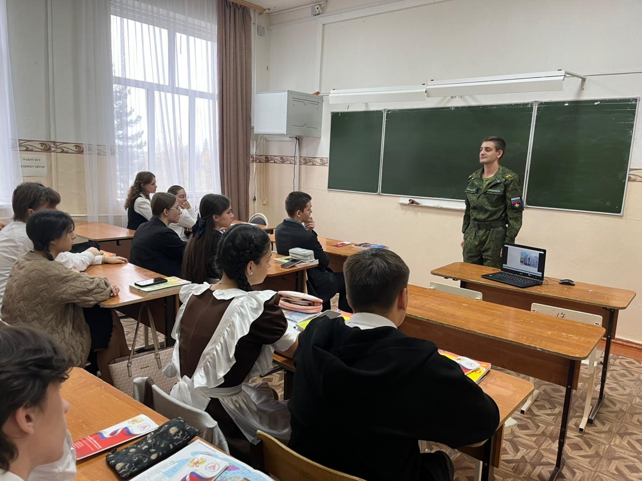 10 ноября курсант кафедры Воздушно-космических сил Военного учебного центра при ЮФУ Демиденко Дмитрий провел профориентационную работу в 10-11-х классах в Кущевском районе Краснодарского края.