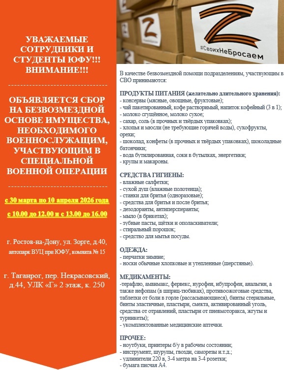 - Объявляется сбор на безвозмездной основе имущества, необходимого военнослужащим, участвующим в Специальной военной операции