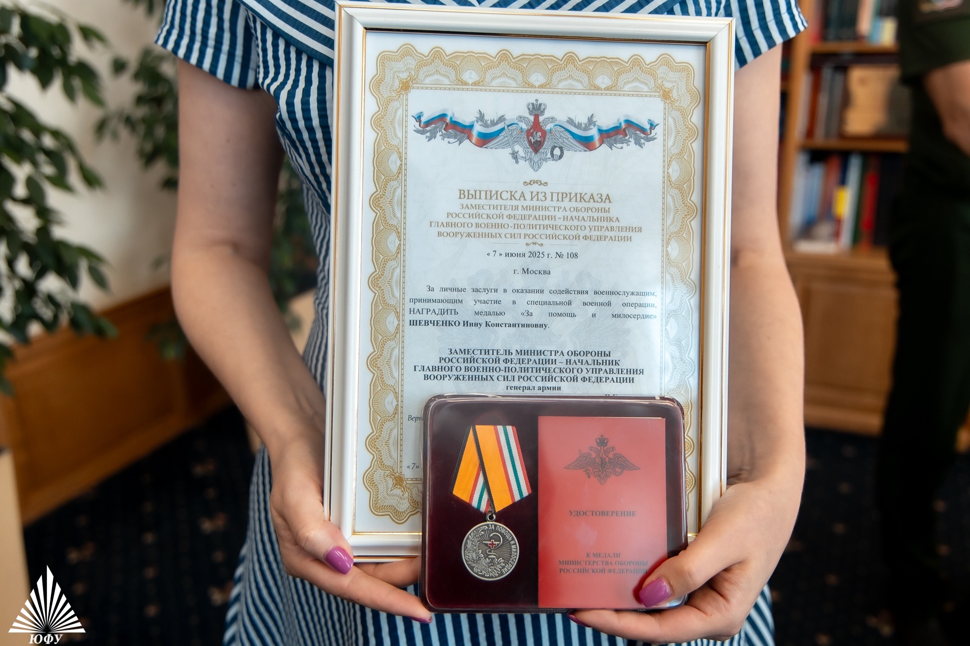За личные заслуги в оказании содействия военнослужащим, принимающим участие в специальной военной операции, начальник Военного учебного центра ЮФУ, кандидат экономических наук, полковник Александр Палеев вручил Инне Шевченко медаль «За помощь и милосердие».